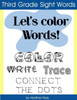 Third Grade Sight Words Let's Color Words! Trace, write, connect the dots and learn to spell! Is your child struggling to read and spell? Perhaps a different approach is needed to reinforce your child's instruction. What better way to learn words than through coloring? Using the Dolch sigh word lists, each sight word is repeated SIX times on each page. Lined space is also provided for your child to practice writing each word as well. We believe by repeatedly coloring and writing words, your child will retain their spelling further helping them with their reading. 41 Third Grade Sight Words to color including: About Better Bring Carry Clean Cut Done Draw Drink Eight Fall Far Full Got Grow Hold Hot Hurt If Keep Kind Laugh Light Long Much Myself Never Only Own Pick Seven Shall Show Six Small Start Ten Today Together Try Warm Use colored pencil, crayon, markers or other coloring medium. If using markers or paint, we recommend either removing the sheet of paper or placing a buffer, such as another sheet or two of paper or thin plastic or cardboard between the coloring pages, so as to prevent bleed through. 8.5 x 11 paper size. Printed on one side of the paper to prevent bleed through. 41 words, each repeated 6 times per page. Color, trace and connect the dots for each word. Lined writing space to practice writing each word. 6 pages of connect the dot words at the end of the book. Matte cover suitable for coloring as well! Find more blank books at www.diaryjournalbook.com Business inquiries, please contact branding@diaryjournalbook.com TAGS: color words, third grade sight words, color and learn, learning by coloring, Dolch sight words, learning aide, kids, coloring, grade school, reading, spelling, spelling help.