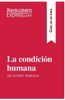 ResumenExpress.com presenta y analiza en esta gu?a de lectura La condici?n humana, de Andr? Malraux. Esta obra, galardonada con el Premio Goncourt, sirve como testimonio de los acontecimientos que se produjeron en Shangh?i en 1927. El autor aprovecha la insurrecci?n comunista y su posterior represi?n como tel?n de fondo para tratar, a trav?s de Kyo, Chen, Katow y otros muchos personajes, el tema de la naturaleza humana. Una reflexi?n filos?fica plasmada sutilmente a lo largo de toda la novela que lo acercar? a la corriente existencialista de Sartre. Ya no tienes que leer y resumir todo el libro, nosotros lo hemos hecho por ti! Esta gu?a incluye: - Un resumen completo del libro - Un estudio de los personajes - Las claves de lectura - Pistas para la reflexi?n Por qu? elegir ResumenExpress.com? Para aprender de forma r?pida. Porque nuestras publicaciones est?n escritas con un estilo claro y conciso que te ayudar? a ganar tiempo y a entender las obras sin esfuerzo. Disponibles en formato impreso y digital, te acompa?ar?n en tu aventura literaria. Toma una dosis de literatura acelerada con ResumenExpress.com